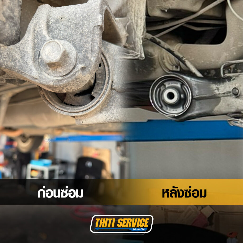 - เปลี่ยนบูชคานหลังใหม่: ถอดประกอบด้วยความชำนาญ เพื่อเปลี่ยนบูชยางชุดใหม่ที่เนียนกริบ แก้ไขปัญหาเสียงดังได้ปลิดทิ้ง และคืนความนุ่มนวลในการขับขี่